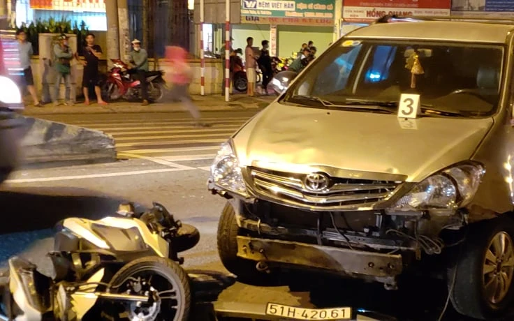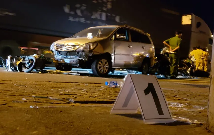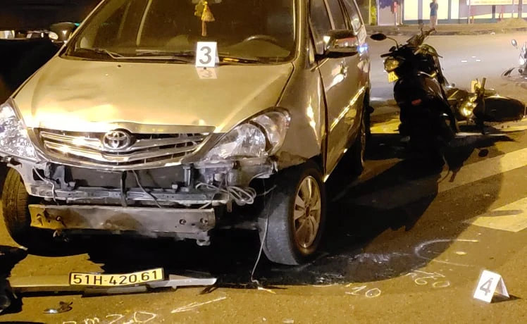 Cụ thể, ô tô đã tông vào xe máy 59S1-991.48 do anh NĐV (41 tuổi, quê Quảng Ngãi), xe máy 61D2-097.64 do anh LCH (35 tuổi, ngụ Bình Dương), xe máy 36B7-769.39 do chị NTP (19 tuổi, quê Thanh Hóa), xe máy 38F1-022.02 do chị PTTr. (25 tuổi, quê Hà Tĩnh) và xe máy 61S4-3333 do chị HBNT (31 tuổi, quê Bình Dương) điều khiển