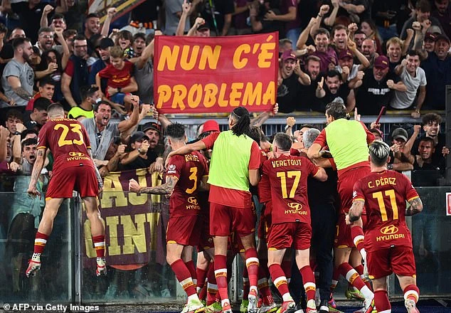 Mourinho ăn mừng điên cuồng cùng các cầu thủ AS Roma. ẢNH: GETTY