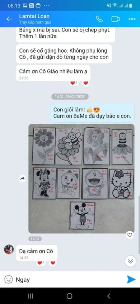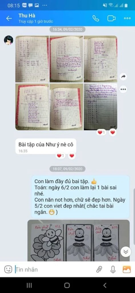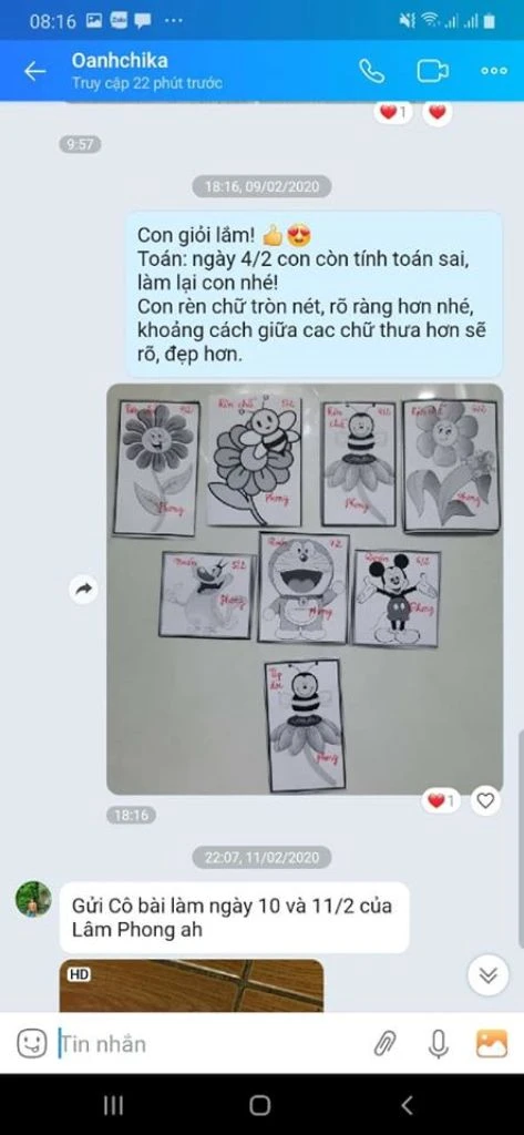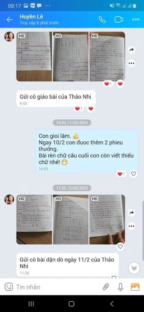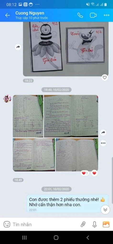 Tận dụng group zalo, giáo viên của trường đã giao bài tập cho các em. Sau đó, nhờ phụ huynh nhắc nhở, giám sát, gửi bài làm trở lại để các cô đánh giá và khen thưởng cho những trò đã làm tốt.