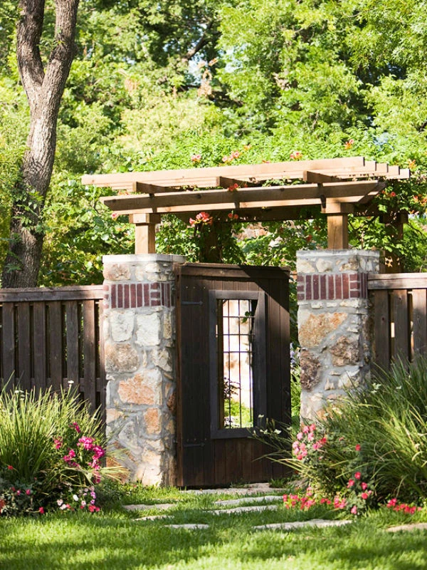 Lối nhỏ vào nhà được thiết kế bởi hệ thống hàng rào gỗ, cổng gỗ mái vòm sơn trắng tạo vẻ đẹp cổ điển và sang trọng cho nhà vườn. Khung cảnh sẽ thêm phần bắt mắt khi có sự góp mặt của màu xanh cây cỏ và vẻ đẹp tươi tắn của sắc hoa. Trồng thêm những khóm hoa nhỏ xinh dọc theo hàng rào cũng là một bí quyết thú vị tô điểm cho cổng vào thêm lãng mạn.