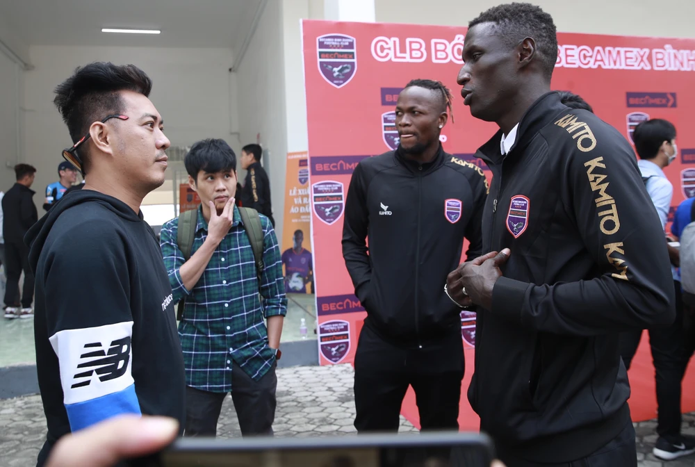 Qua Omar Faye (bìa phải), Mansaray giải thích và có ý xin lỗi với PV Nguyễn Khoa và Duy Anh. Ảnh: A.PHƯƠNG