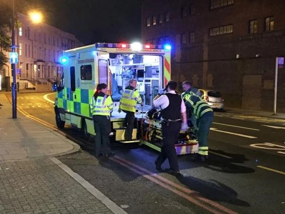 Cảnh sát đưa người bị thương lên xe cấp cứu. Ảnh: INDEPENDENT