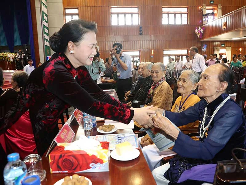 Chủ tịch Quốc hội Nguyễn Thị Kim Ngân thăm hỏi các Mẹ Việt Nam anh hùng tại lễ kỷ niệm. Ảnh: TTXVN