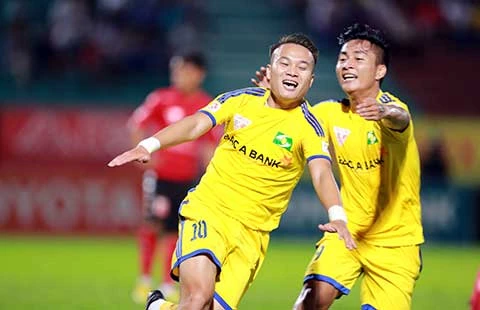 Phi Sơn và Tấn Tài, hai cầu thủ nội và trẻ ghi hai bàn cho SL Nghệ An. Ảnh: XUÂN HUY