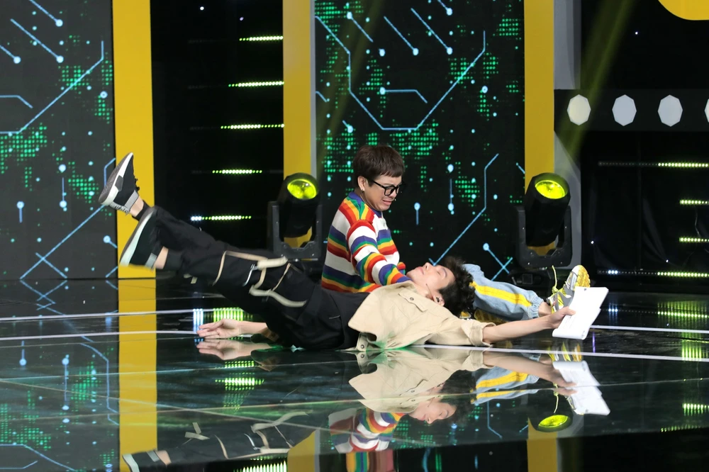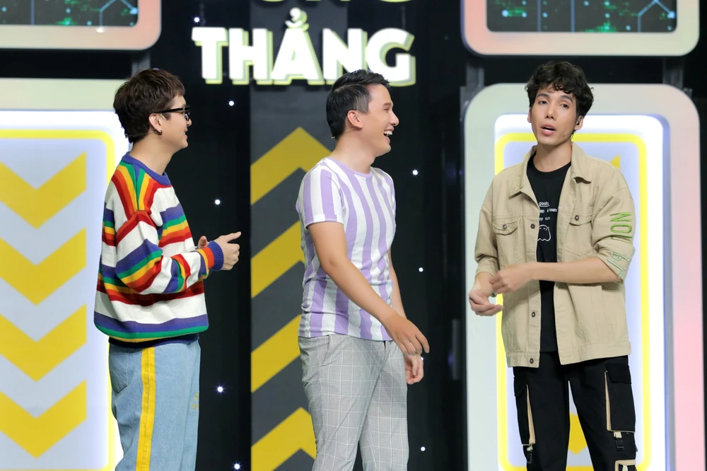 Sự xuất hiện bất ngờ của hai cậu bạn thân thiết là diễn viên Hữu Đằng và ca sĩ Khắc Minh khiến Dương Thanh Vàng vừa thấy đã tỏ vẻ ngán ngẩm, đặc biệt là đối với trang phục sọc dọc sọc ngang rất rối mắt của hai cậu bạn.
