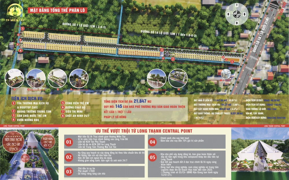 Đại diện chủ đầu tư thông tin thêm, Long Thạnh Central Point Hậu Giang có quy mô 21.647,93 m2, gồm 145 căn nhà phố thương mại (shophouse) bàn giao hoàn thiện, chìa khóa trao tay. Về cơ sở hạ tầng, dự án có lòng đường 6 m, vỉa hè 3 m, lộ giới 12 m…