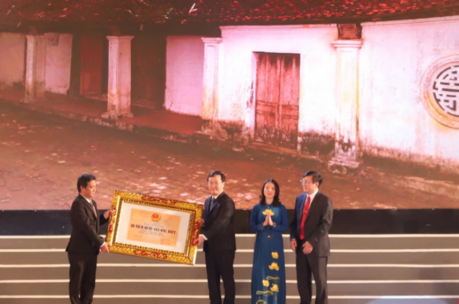 Lãnh đạo UBND tỉnh Nghệ An và UBND huyện Nam Đàn đón nhận Bằng công nhận Di tích Quốc gia đặc biệt đình Hoành Sơn.