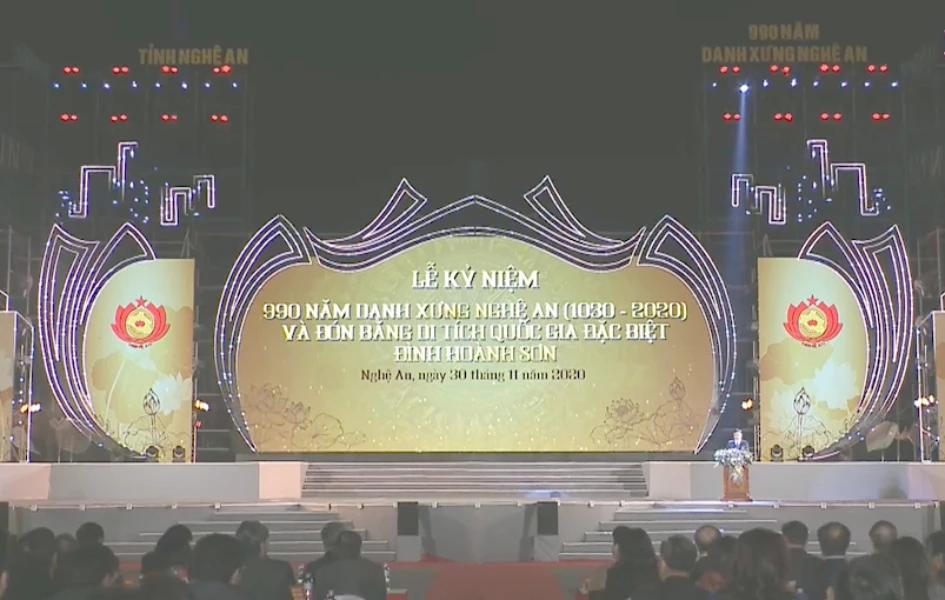 Tối 30-11, tại Quảng trường Hồ Chí Minh (TP Vinh, Nghệ An) đã long trọng tổ chức Lễ kỷ niệm 990 năm Danh xưng Nghệ An (1030- 2020) và đón Bằng công nhận Di tích Quốc gia đặc biệt đình Hoành Sơn (huyện Nam Đàn, Nghệ An).