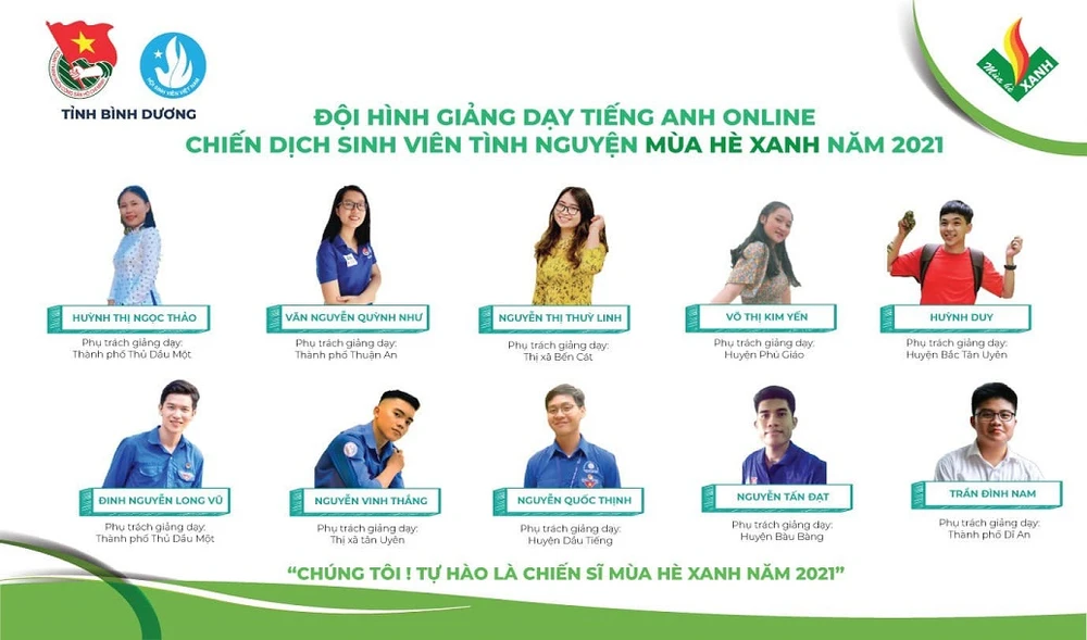 Trong thời gian giãn cách do COVID-19, Ban Thư ký Hội Sinh viên tỉnh Bình Dương phối hợp với Hội đồng Đội tỉnh Bình Dương triển khai đội hình sinh viên tình nguyện "Mùa hè xanh" dạy tiếng Anh online miễn phí cho học sinh tiểu học tại 9 huyện, thị xã, thành phố trên địa bàn tỉnh.