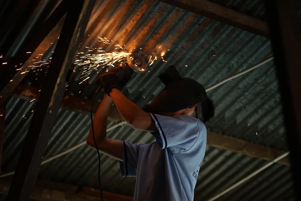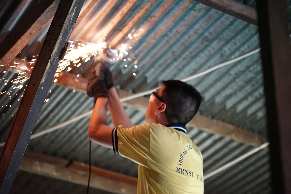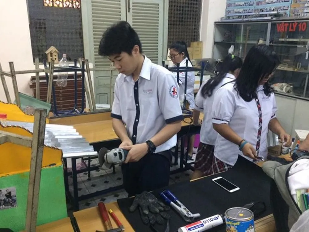 Thứ bảy hằng tuần hoặc ngoài giờ học, phòng thí nghiệm Vật lý của trường lại vang lên những âm thanh cưa khoan, đục khoét, hàn xì... Ở đó, dù nam hay nữ, tất cả đều hối hả làm việc như những công nhân cơ khí thực thụ. Nào là nhóm thử mạch, nối cầu chì, khoan và cưa tôn, trèo thang thử bóng đèn, nhóm mày mò kiến thức từ máy tính...