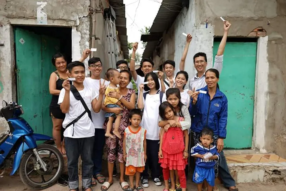 Sau khi lắp đặt thành công và hoàn tất dự án, thầy trò chụp ảnh kỷ niệm với những người dân tại xóm trọ nghèo dưới chân cầu Tám Nó.