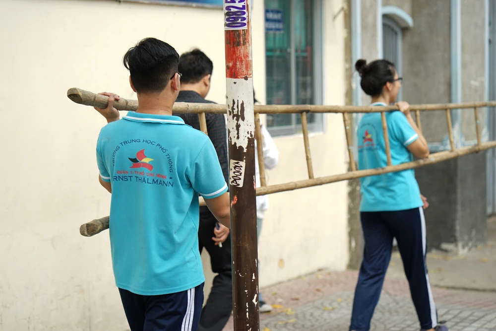 Theo dõi quá trình các em làm, nhìn các em leo trèo, khoan lắp một cách thành thạo, thi công tỉ mỉ từng chút một để lắp hoàn thiện những bóng đèn không ai nghĩ đó là những em HS trung học. Nhìn các em không khác gì những người thợ chuyên nghiệp.