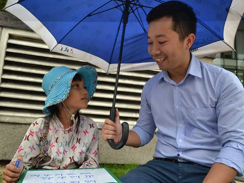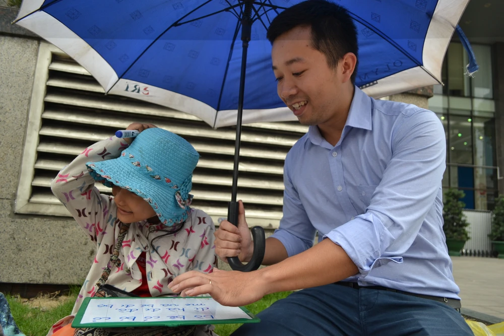 12 giờ trưa 16-5, nắng gắt. Trên đường Trần Hưng Đạo, phường 1, quận 5, ngay trước trụ sở một ngân hàng, góc bồn hoa, một thanh niên cao ráo ngồi dạy một bé gái bán vé số học chữ. Tay cầm bảng con, tay cầm dù che nắng cho đứa trẻ, thầy dạy trò đánh vần từng chữ.