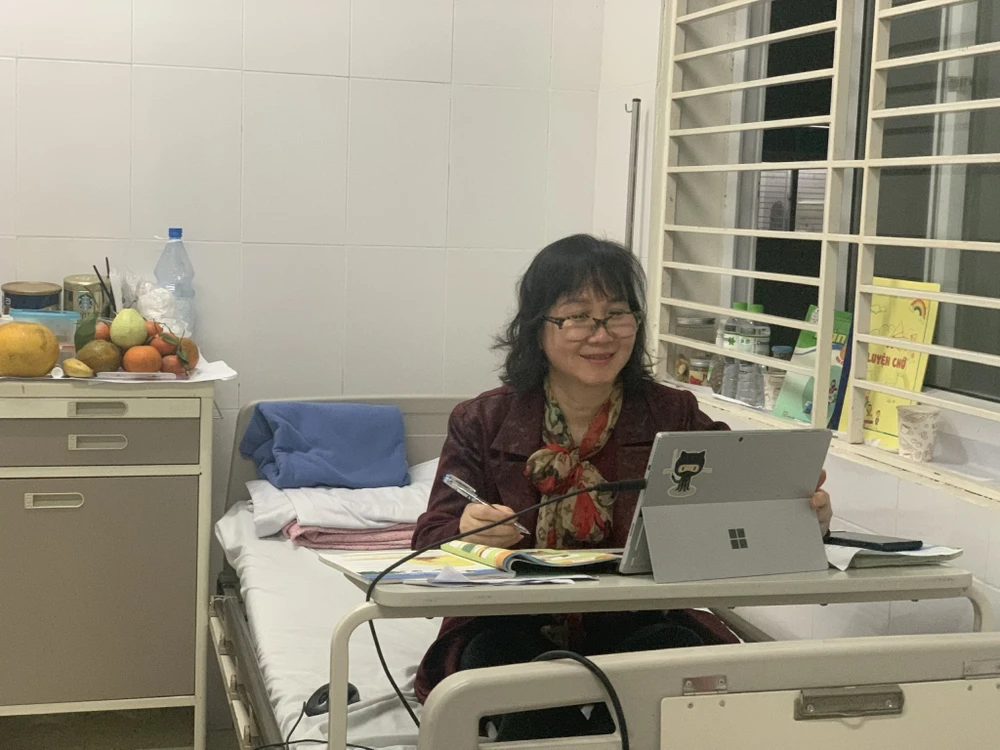 Cô Dung vẫn chăm chú giảng bài mỗi tối trong thời gian nằm điều trị tại bệnh viện vì COVID-19. Ảnh CTV