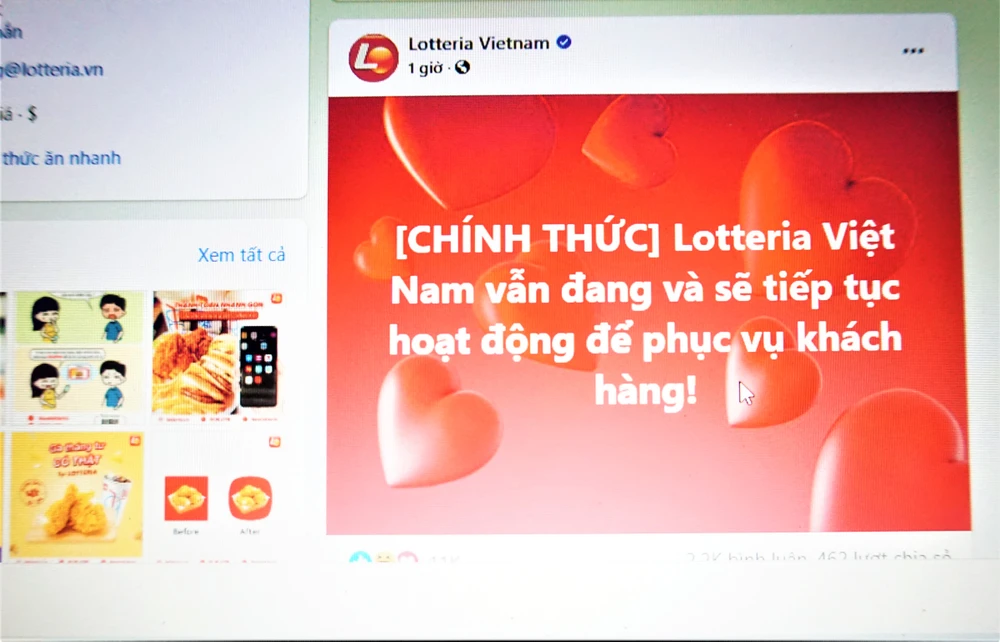 Khẳng định điều này, trên Fanpage của Lotteria cũng đăng tải thông tin Lotteria Việt Nam vẫn đang và sẽ tiếp tục hoạt động để phục vụ khách hàng.