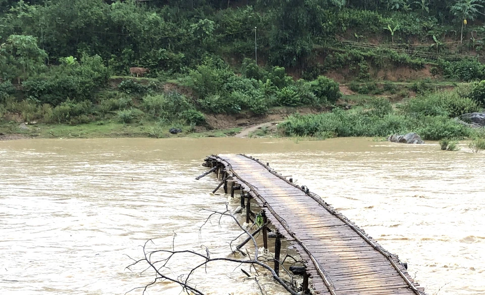 Cầu tạm duy nhất nối giữa bản Lầm (Trung Tiến) sang quốc lộ 217 bị lũ cuốn dần sau mưa lũ. Ảnh: HUYỀN TRÂN