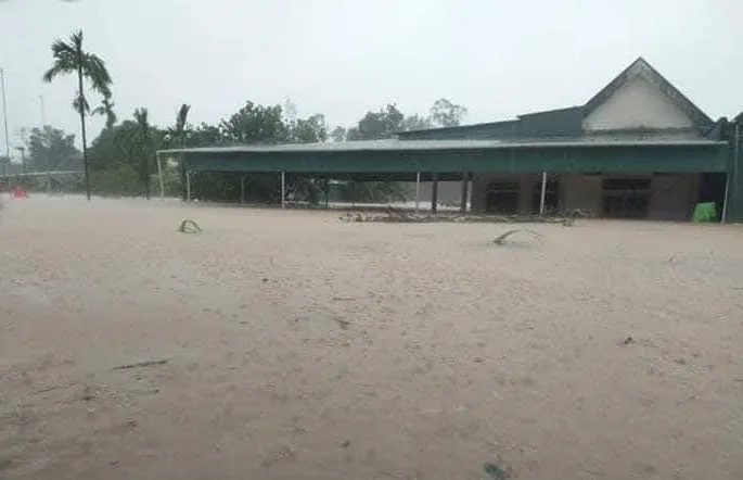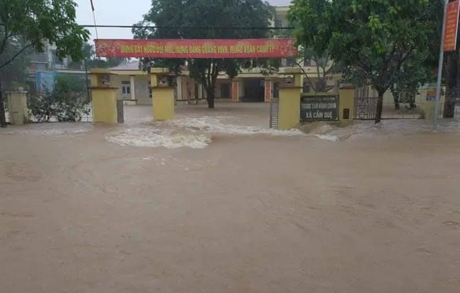 Nước lũ chảy cuộn cuộn vào sân trụ sở UBND xã Cẩm Duệ. Ảnh: CTV.