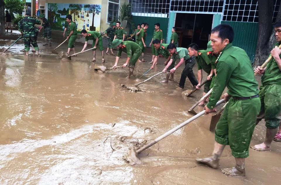 Công an giúp trường học và người dân ở huyện Kỳ Sơn dọn bùn sau lũ dữ.
