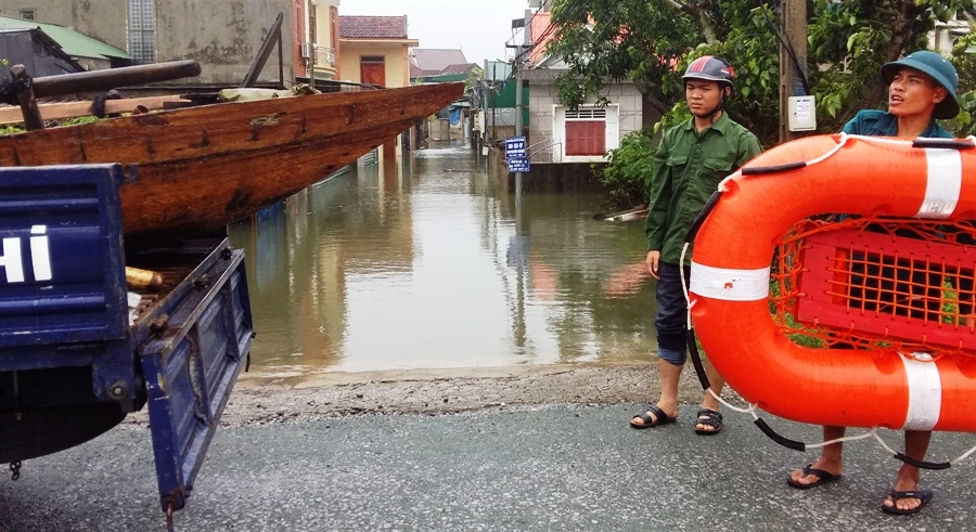 Mang thuyền, phao cứu sinh đi cứu dân mắc kẹt trong nước lũ ở Nghệ An. Ảnh: Đ.LAM