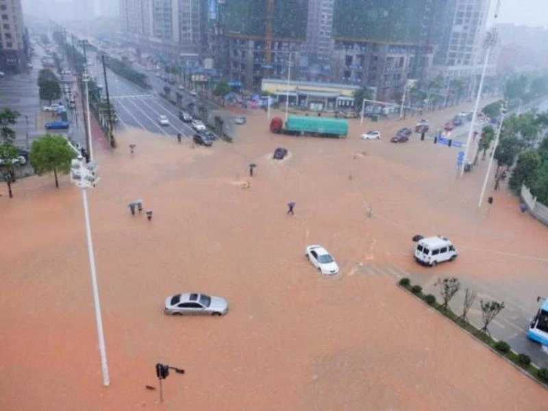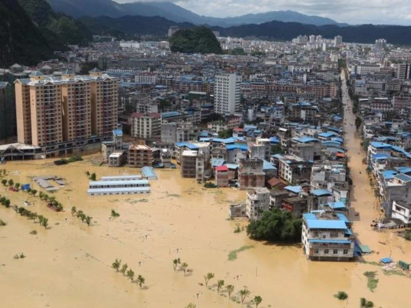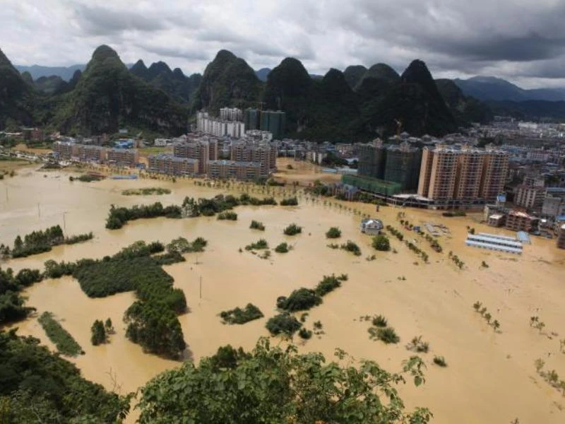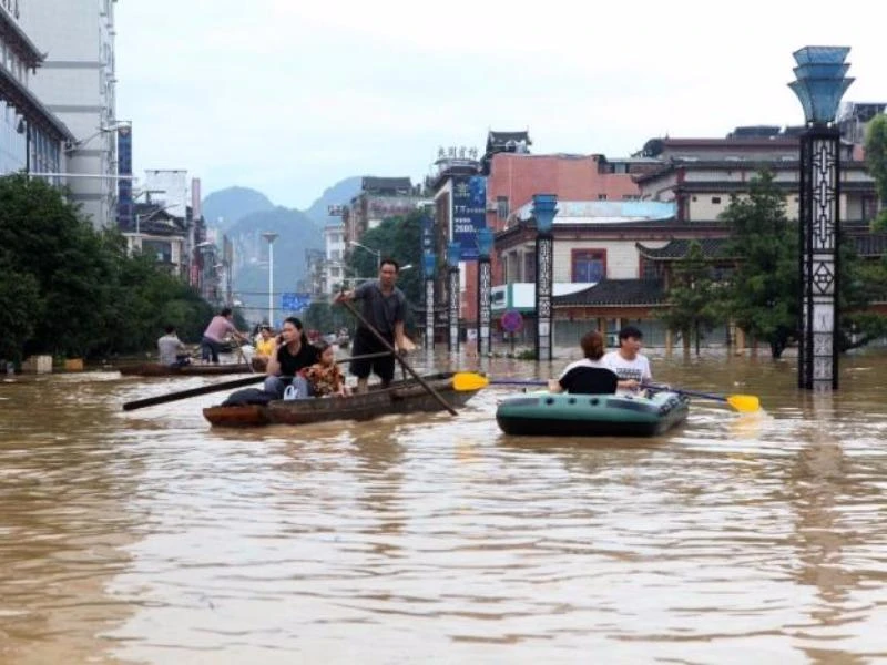 Ở Quảng Tây, lũ lớn đã làm ngắt mạch giao thông, với 45 chuyến tàu hỏa bị hủy. Tại Giang Tây (tỉnh giáp Hồ Nam), lũ lớn đã khiến hai người thiệt mạng và hai người còn mất tích. Khoảng 440.000 dân ở tỉnh này đã được sơ tán hôm 1-7. Trong ảnh: Cảnh TP Trường Sa, Hồ Nam bị ngập úng sau mưa lớn hôm 1-7. Ảnh: REUTERS