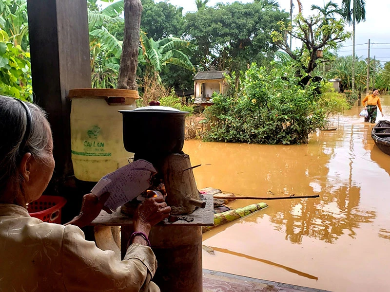 Nhà bà có tám người, bốn người lớn, bốn trẻ con. Nghe tin nước lũ về, cả nhà chỉ kịp hò nhau kê thóc, đồ đạc lên cao thì nước đã tràn vào nhà. Mấy hôm nước ngập sâu, mất điện, cả nhà phải nấu cơm bằng bếp lò, không dám dùng bếp gas vì sợ nổ.