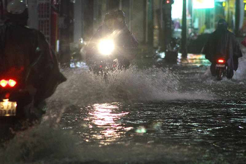 Trong chiều nay, tại TP Huế có mưa lớn kéo dài khiến nhiều tuyến đường như Hùng Vương, Trần Quang Khải, Trường Chinh, Tôn Đức Thắng... ngập nặng, gây khó khăn cho việc đi lại của người dân, nhiều người phải lội bì bõm trong nước.