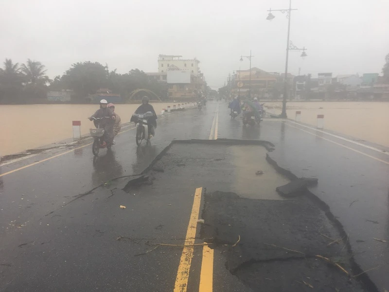 Sáng 8-11, Đập Đá ngăn giữa sông Hương với sông Như Ý (TP Huế, tỉnh Thừa Thiên-Huế) nước lũ đã rút dần cũng là lúc hiện ra những hư hỏng nặng nề trên mặt đập.