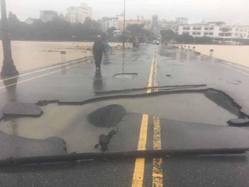 Theo ghi nhận của PV, trên mặt đường, lớp nhựa thảm trên cùng đã nước lũ làm bong tróc 5-6 điểm. Mỗi điểm sâu 20-30 cm, rộng 1 m2 đến trên 30 m2.