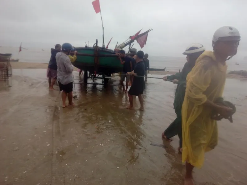 Ngư dân kéo tàu lên bờ chạy bão vào chiều tối 12-9. Ảnh: LÊ PHI