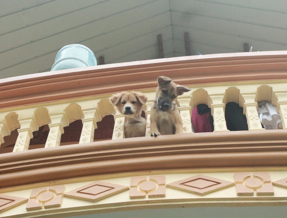 Hai chú chó được gia chủ đưa lên tầng thượng của ngôi nhà hai tầng. Phía dưới, nước đã ngập sâu toàn bộ.