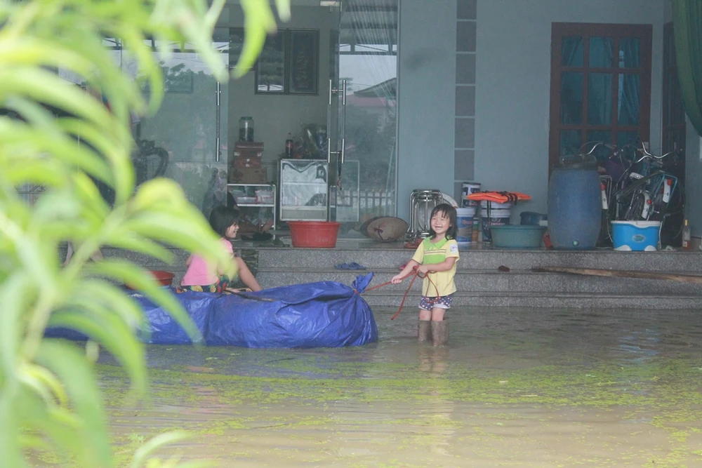 Nước ngập sâu vào tận cửa, hai em nhỏ nô đùa dưới sân với chiếc thuyền tự chế của cha mẹ.