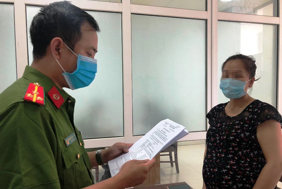 Công an tống đạt quyết định khởi tố bị can đối với bà Phạm Thị Hiền. Ảnh: H.H