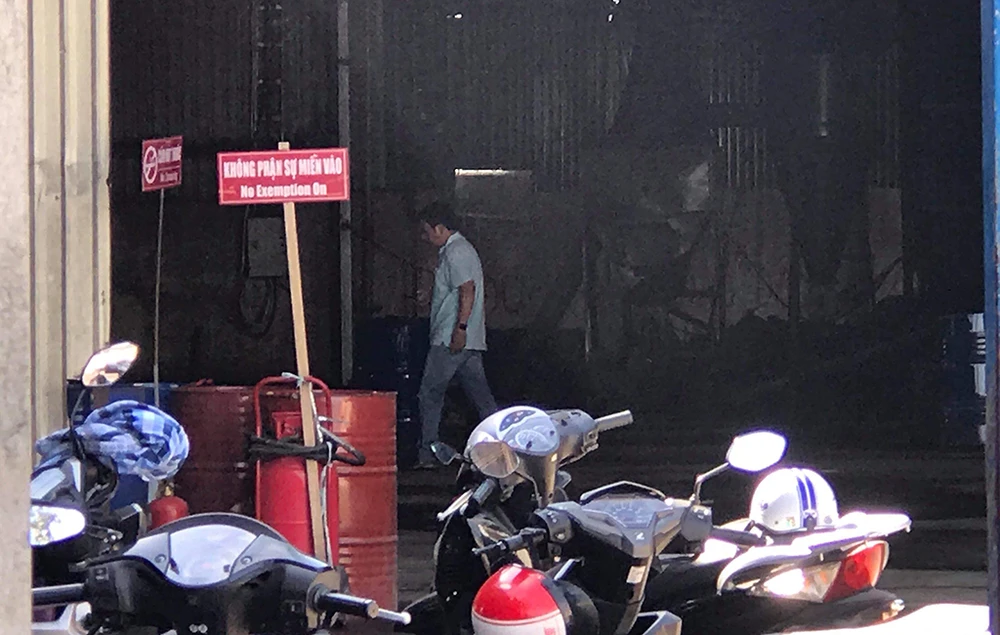 Theo ghi nhận, nhà xưởng này có mái tôn, bên ngoài không có bảng hiệu, được bao bọc bằng tường xây và cổng sắt khá kiên cố. Bên trong xưởng có nhiều thùng phuy bằng sắt.