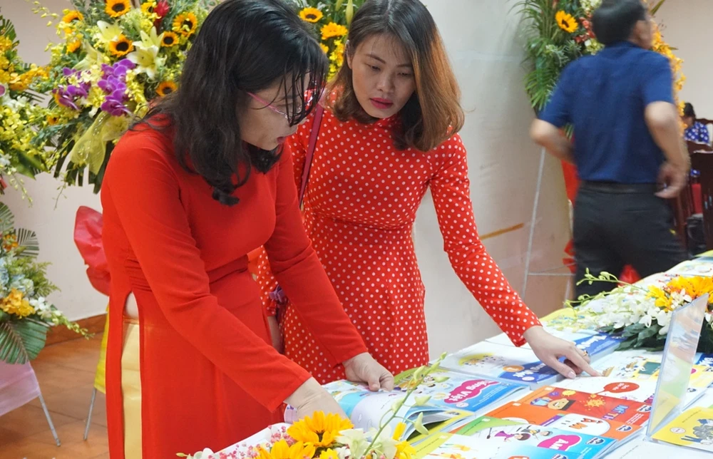 Các đại biểu đang xem bộ sách "Chân trời sáng tạo" do Sở GD&ĐT TP.HCM phối hợp với Nhà xuất bản Giáo dục Việt Nam biên soạn tại lễ kỷ niệm 40 năm thành lập Nhà xuất bản Giáo dục Việt Nam tại TP.HCM. Ảnh: NGUYỄN QUYÊN