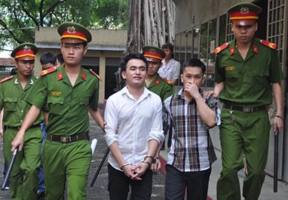 Hai bị cáo Tuấn (áo trắng) và Xum (áo ca rô) sau phiên tòa xét xử. Ảnh : Chu Du
