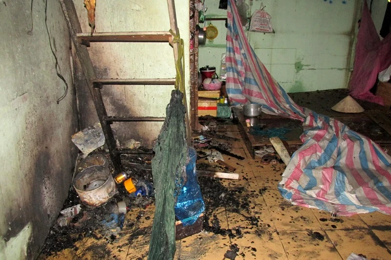 Tầng gác của một nhà trọ đã bị cháy đen, các vật dụng đã bị thiêu rụi hoàn toàn