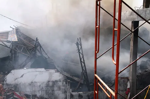 Tại hiện trường, lửa lớn đã thiêu rụi toàn bộ nhà xưởng cùng hai căn nhà liền kề bị ảnh hưởng nặng, một biệt thự gần đó cũng bị cháy xém.