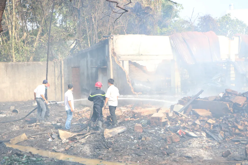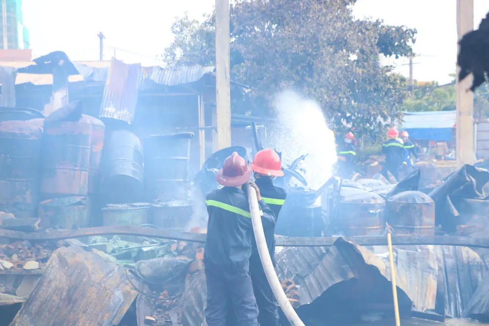 Ghi nhận tại hiện trường, kho chứa thùng phi có dính hóa chất bị cháy rụi hoàn toàn, một quán nhậu bên cạnh cũng bị ngọn lửa lan sang thiêu rụi.