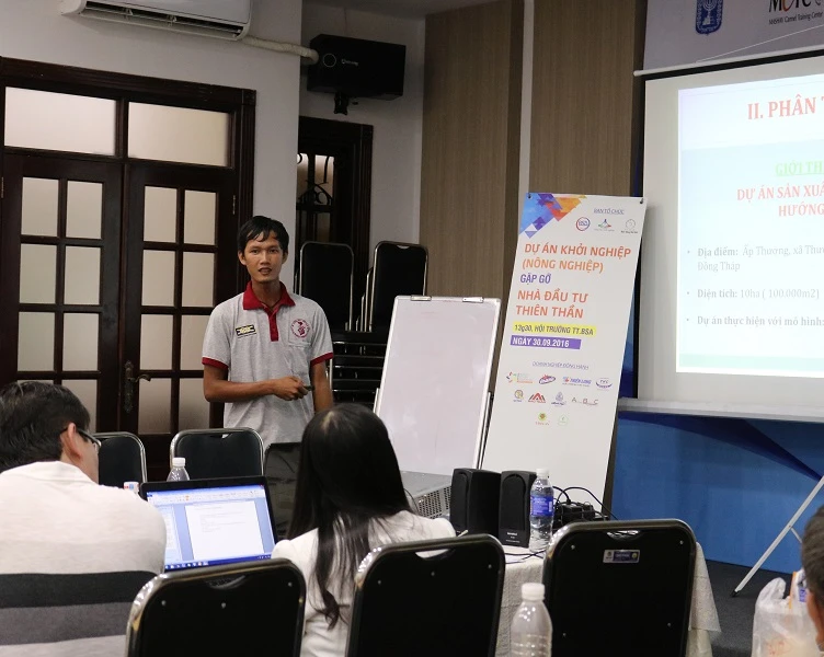 Võ Văn Tiếng giới thiệu dự án của mình trước vòng chung kết. Ảnh: THANH TUYỀN
