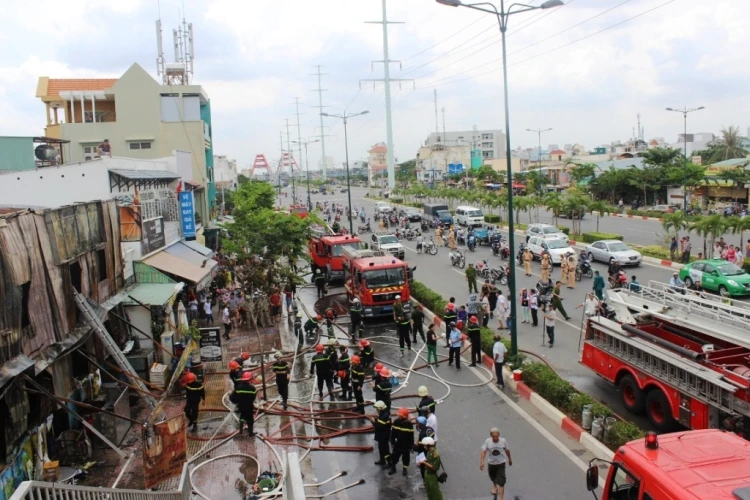 Nhận được tin báo, Cảnh sát PCCC Q.Bình Thạnh phối hợp với PCCC Q.Gò Vấp đã điều 7 xe chuyển dụng, trong đó có xe thang nhanh chóng có mặt tại hiện trường để khống chế ngọn lửa. Làn xe máy trên đường Phạm Văn Đồng đoạn từ giao lộ Nguyễn Xí đến hiện trường vụ cháy được CSGT, dân phòng phong tỏa nghiêm ngặt.