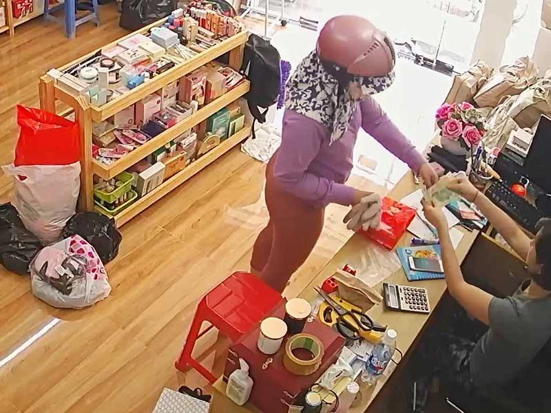 Tiệm mỹ phẩm trên đường Đình Phong Phú (phường Tăng Nhơn Phú B, quận 9, TP.HCM) bị người phụ nữ bịt mặt lừa gần 1 triệu đồng. (Ảnh cắt từ clip)