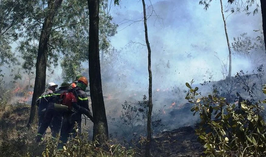 Cảnh sát nỗ lực chữa cháy cứu rừng sim, bạch đàn, keo ở núi Thành (huyện Hưng Nguyên, Nghệ An).