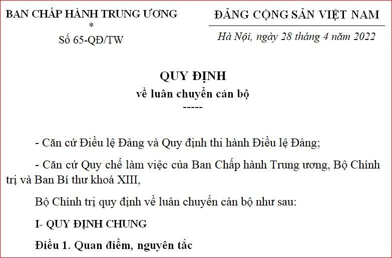 Ngày 28-4, Bộ Chính trị khóa XIII đã ban hành Quy định số 65-QĐ/TW về luân chuyển cán bộ, thay cho Quy định 98-QĐ/TW của Bộ Chính trị khóa XII, ban hành năm 2017, cũng về vấn đề luân chuyển cán bộ.