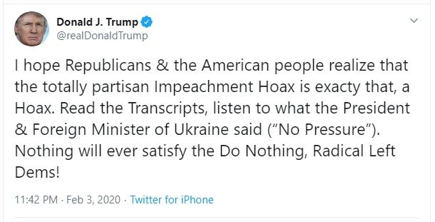 "Tôi hy vọng đảng Cộng hòa và người dân Mỹ nhận ra rằng phiên tòa luận tội mang tính đảng phái này là một trò lừa bịp. Hãy nghe bản ghi âm, nghe những gì Tổng thống và Ngoại trưởng Ukraine nói. Họ nói: "Không có sức ép nào". Không gì làm thỏa mãn đảng Dân chủ chỉ còn cực đoan và không làm được gì đó" - ông Trump viết.
