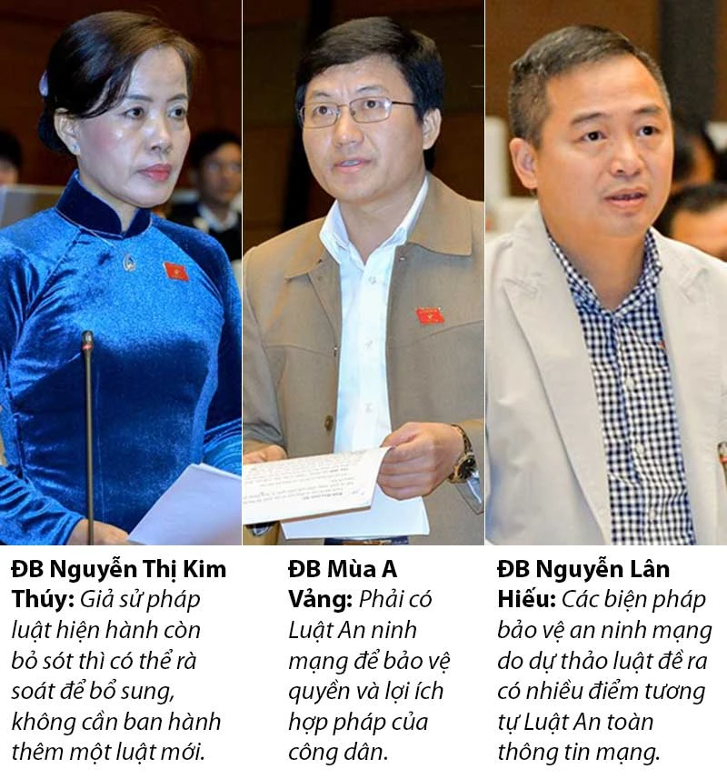 Đại biểu (ĐB) Nguyễn Thị Kim Thúy (Đà Nẵng) cho rằng trong 10 lý do mà Chính phủ cho rằng cần thiết để xây dựng và ban hành Luật An ninh mạng thì có nhiều lý do chưa thuyết phục. Bởi những vấn đề đó đã có Luật An ninh quốc gia 2004, Luật An toàn thông tin mạng 2015 điều chỉnh. “Giả sử hai luật này còn bỏ sót những quy định nào đó liên quan đến việc bảo vệ an ninh quốc gia trên mạng thì có thể rà soát để bổ sung, không cần ban hành thêm một luật mới” - ĐB Thúy nói.