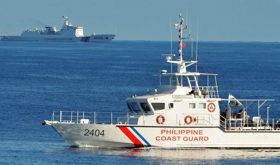 Một tàu hải cảnh Philippines lướt qua tàu hải cảnh Trung Quốc trong cuộc tập trận tìm kiếm và cứu nạn chung giữa lực lượng hải cảnh Philippines và Mỹ gần bãi cạn Scarborough trên Biển Đông hồi tháng 5-2019. Ảnh: AFP