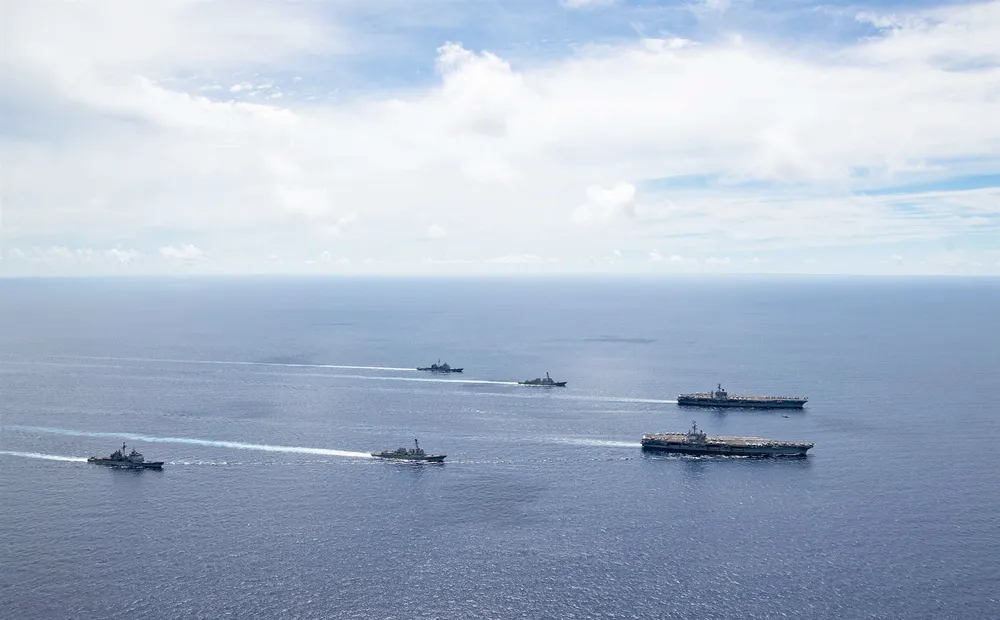 Hai nhóm tác chiến tàu sân bay USS Ronald Reagan và USS Nimitz tiến vào Biển Đông để tập trận hồi tháng 7-2017. Ảnh: AP