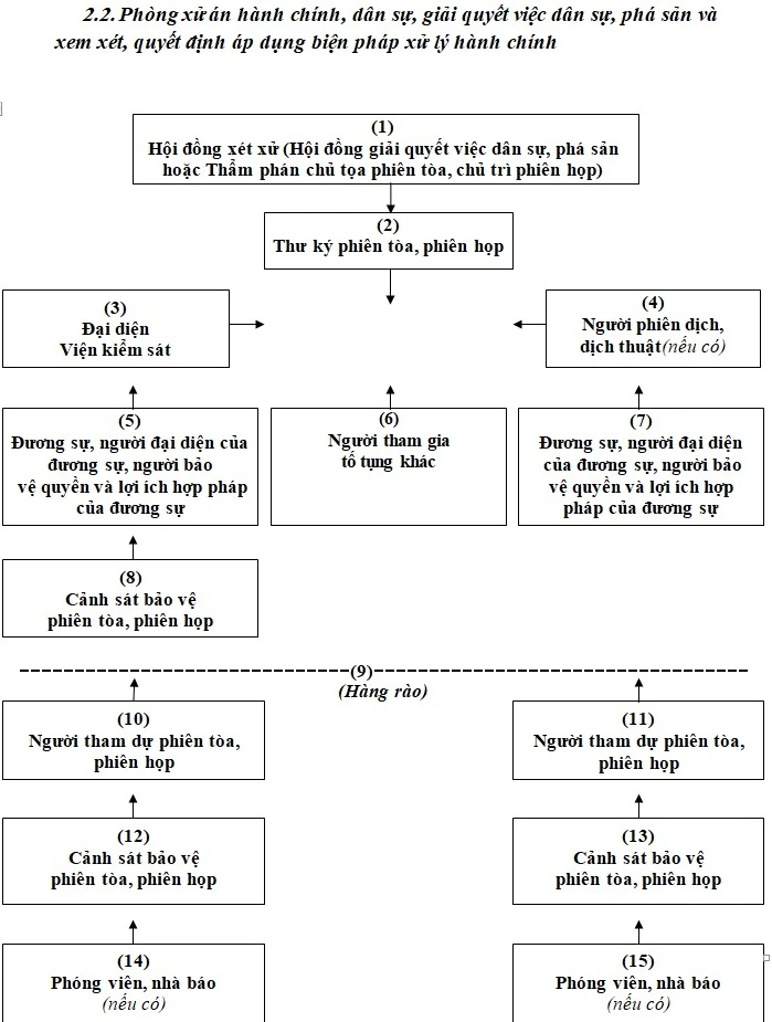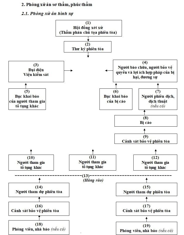 Cụ thể, vị trí của đại diện VKS và vị trí của người bào chữa, người bảo vệ quyền và lợi ích hợp pháp của bị hại, đương sự được bố trí đối diện với nhau và ở dưới vị trí của thư ký phiên tòa.