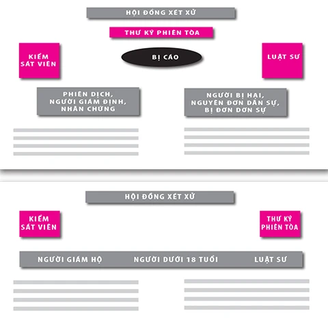 Ảnh 1:Mô hình phòng xử án đối với vụ án hình sự thông thường.Ảnh 2:Mô hình phòng xử án đối với vụ án hình sự có bị cáo là người dưới 18 tuổi. Đồ họa: T. HOAN