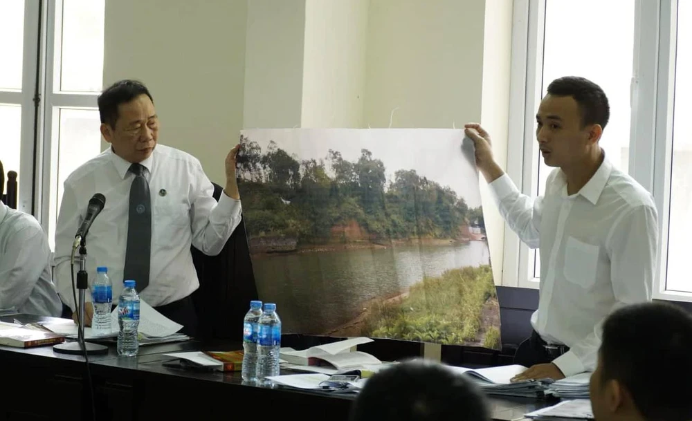 Luật sư đưa ra hình ảnh hiện trường khu vực Cổ Ngỗng, nhân chứng cho rằng nhóm cửu vạn không thể nhảy từ trên đồi dốc xuống đò rồi vác hàng từ đò lên đồi dốc.